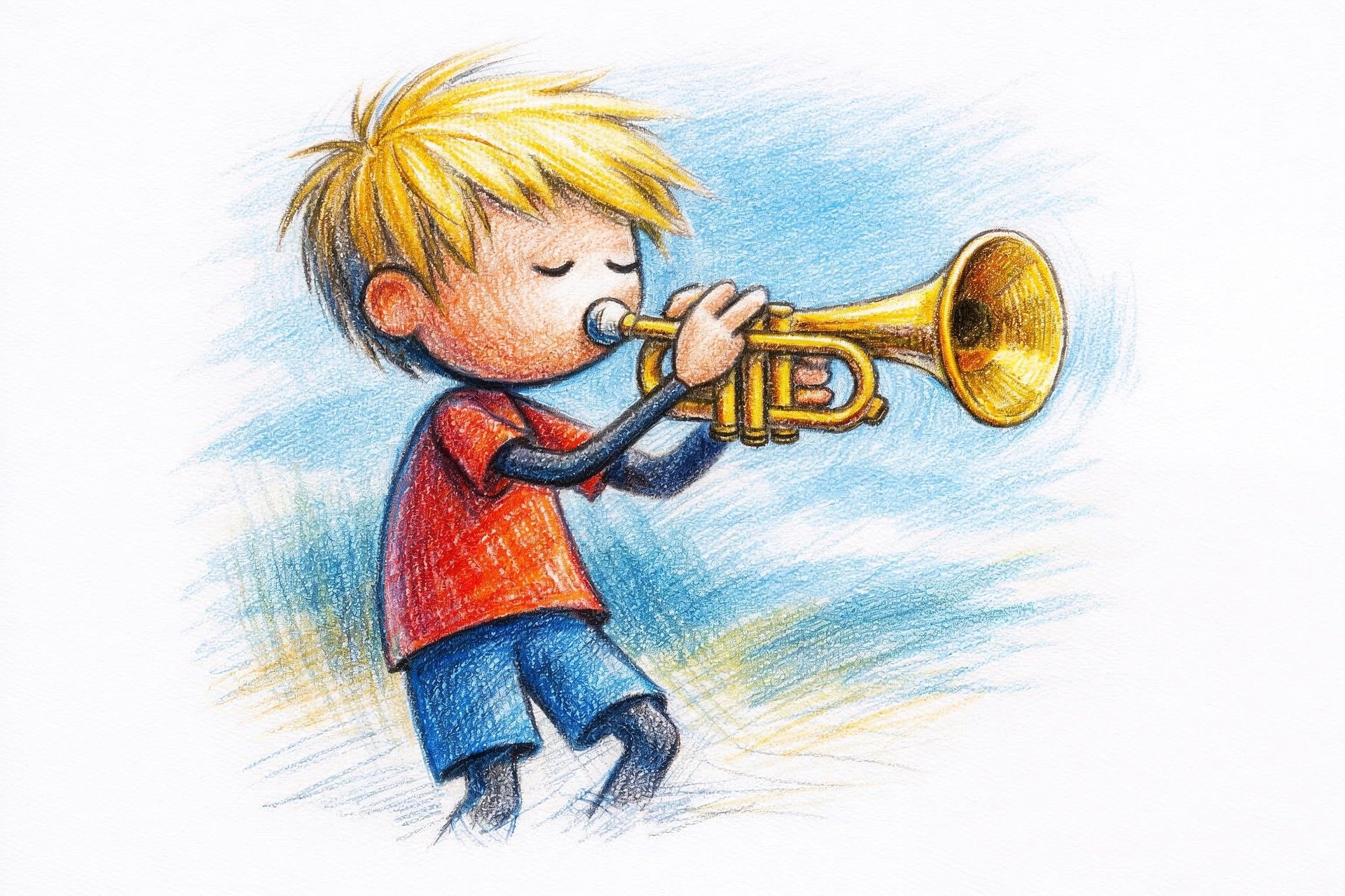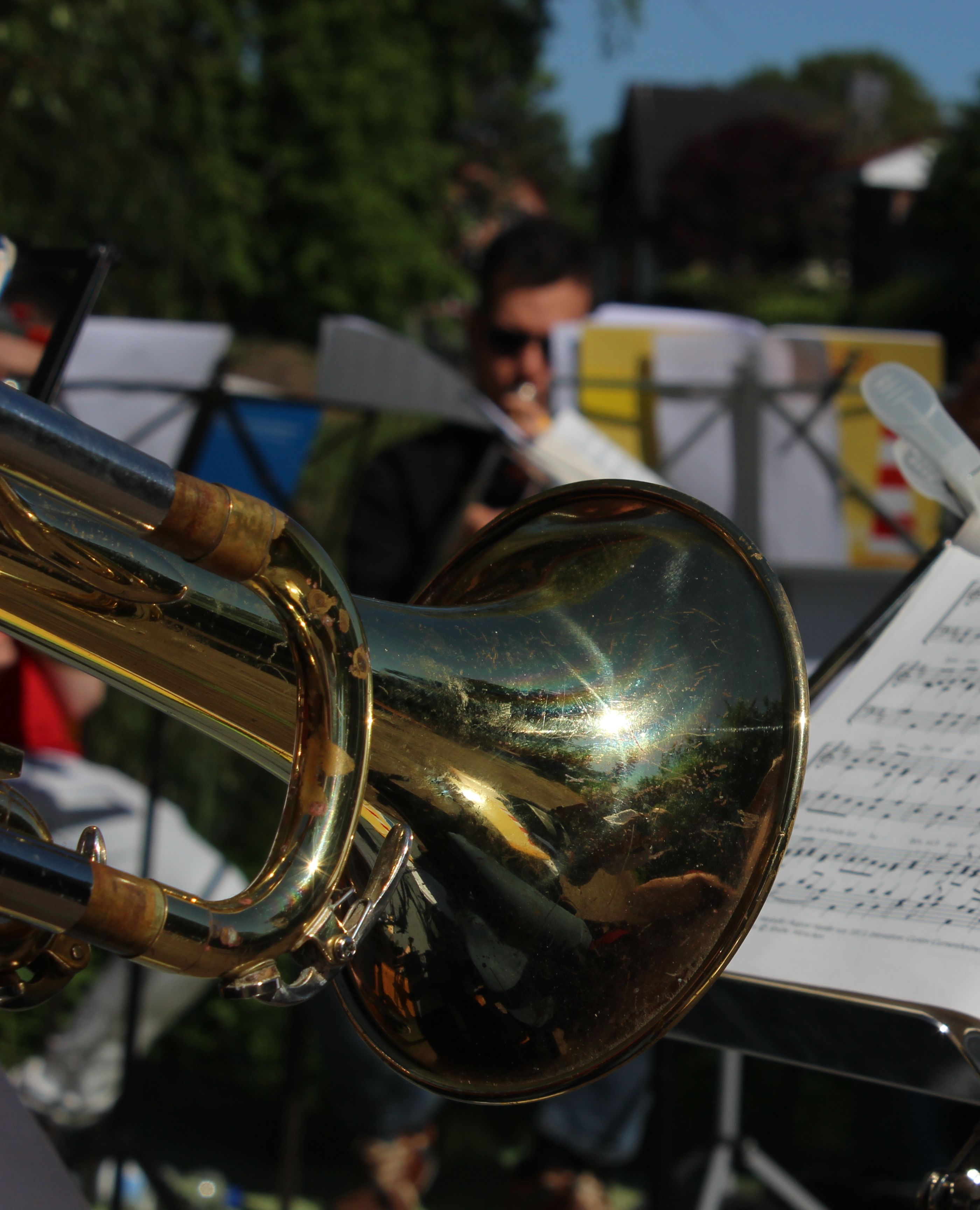 Seite August 2025 trifft sich wöchentlich eine Jungbläsergruppe mit 10 Kindern und einer Erwachsenen, um das Spielen auf Trompete, Posaune oder Horn zu erlernen.